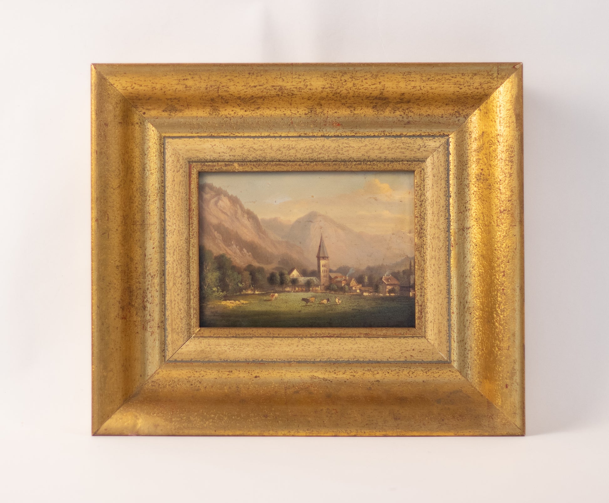 Dieses stimmungsvolle Ölgemälde auf Holz bietet einen wunderschönen Einblick in die alpine Romantik des 19. Jahrhunderts. Das Werk zeigt eine idyllische Ansicht des Schweizer Dorfes Meiringen im Berner Oberland, erkennbar an der charakteristischen Michaelskirche mit ihrem schlanken Turm. Im Vordergrund grasen Kühe auf einer sonnenbeschienenen Wiese, während die imposanten Bergketten im Hintergrund in ein sanftes, stimmungsvolles Licht getaucht sind.