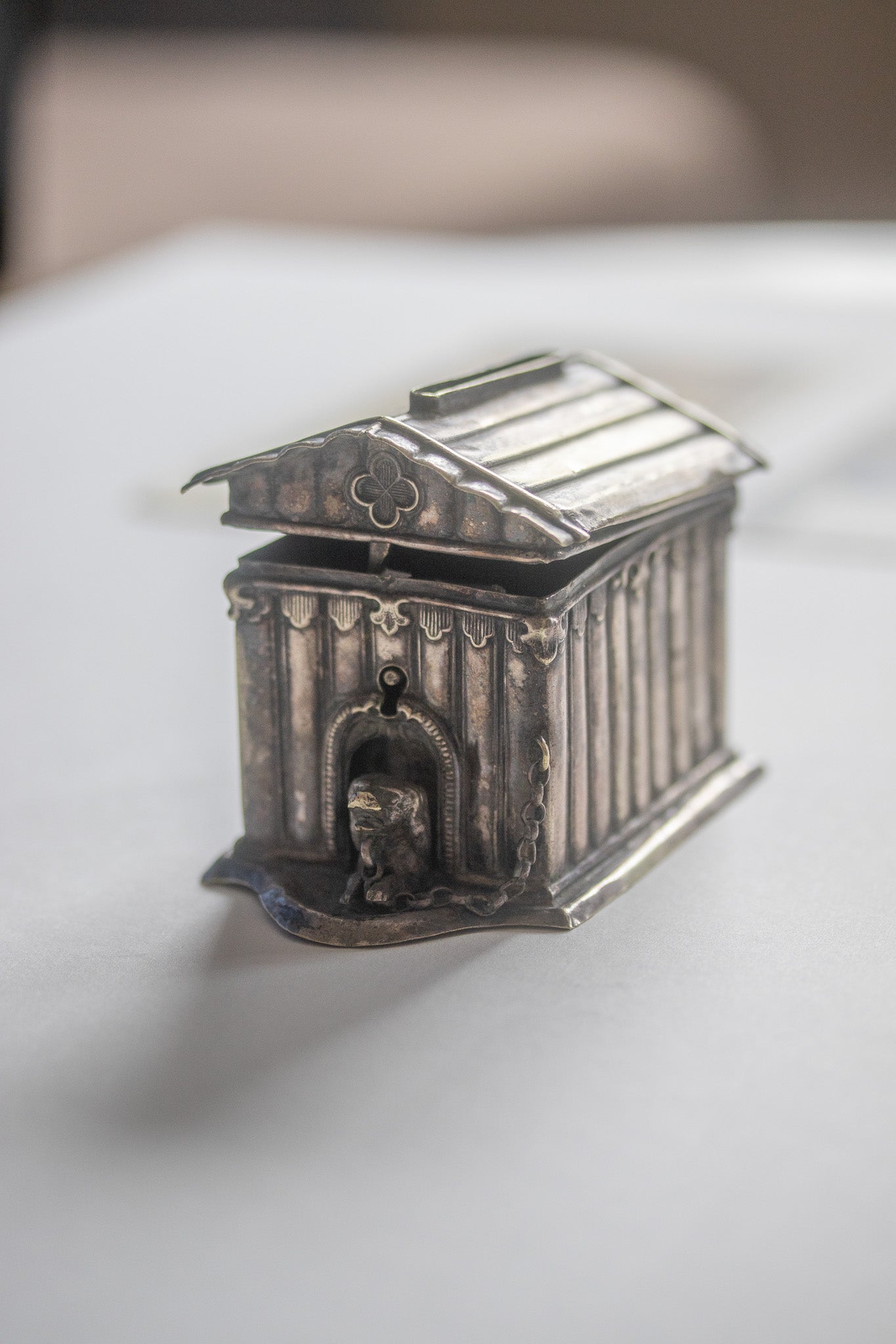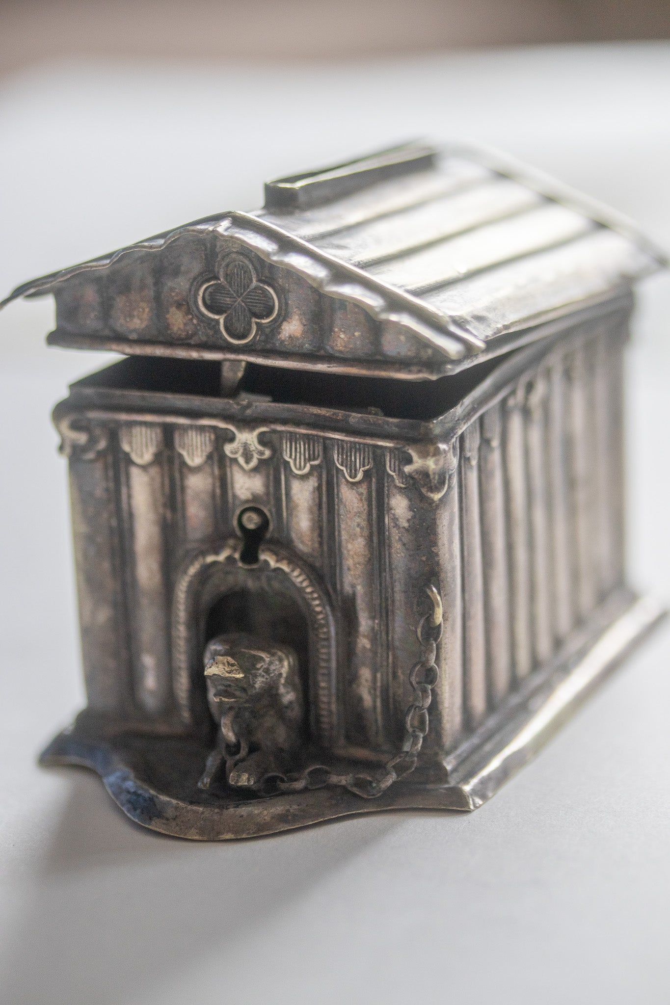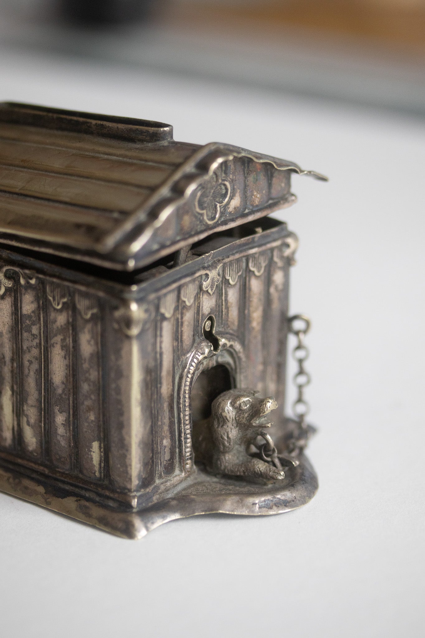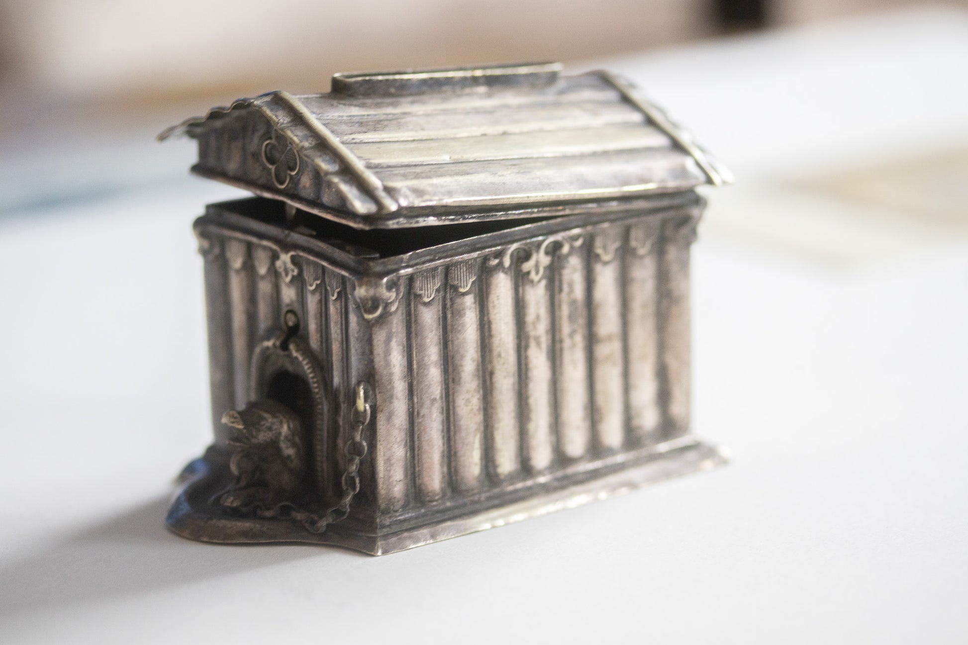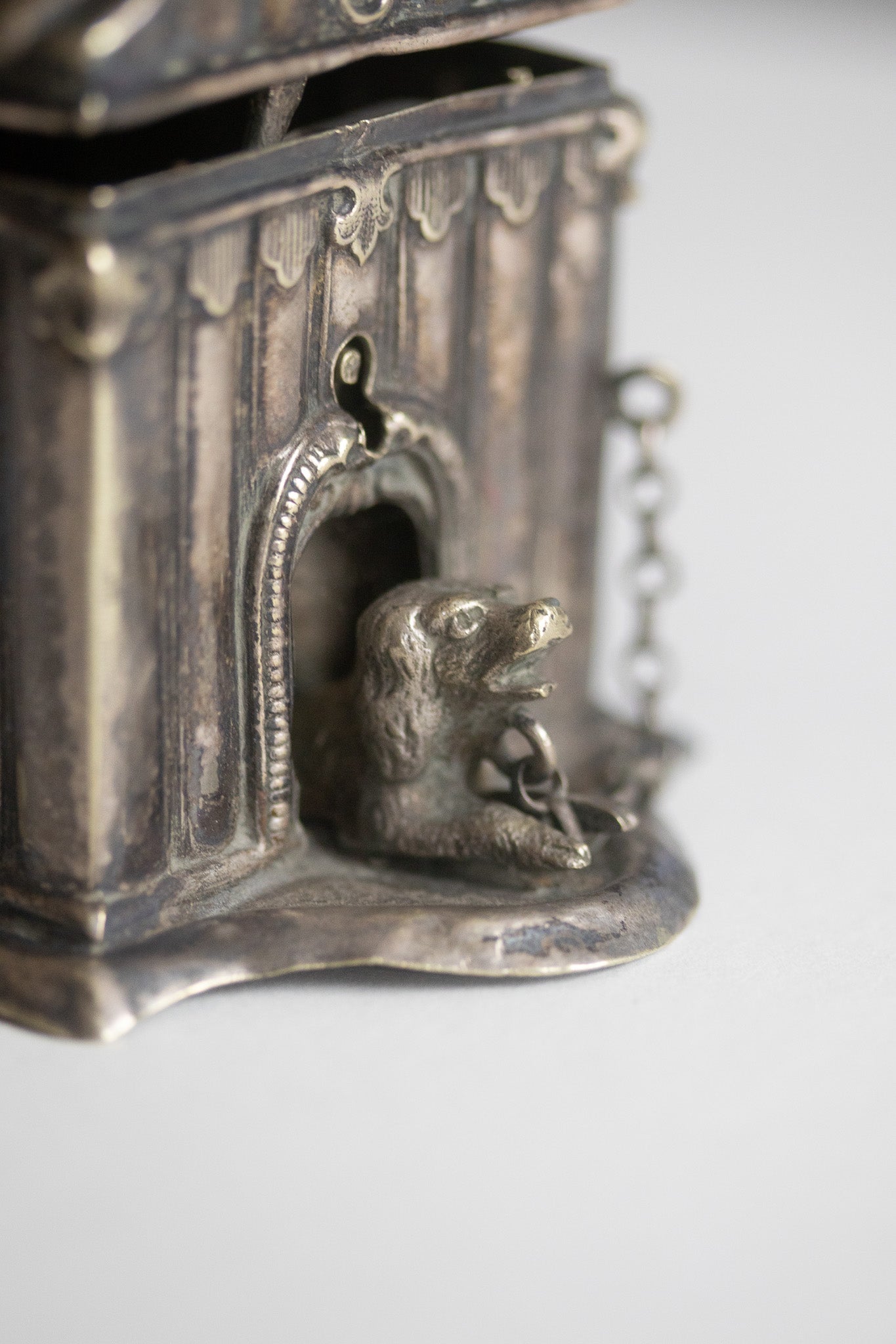 Das versilberte Objekt ist als Hundehütte im klassischen Stil gestaltet, mit Säulen und einem detailreichen Dach. Ein kleiner Hund, seitlich angekettet, schaut aus der Öffnung hervor. Die Unterseite trägt die Aufschrift „ALEX. KATSCH.“