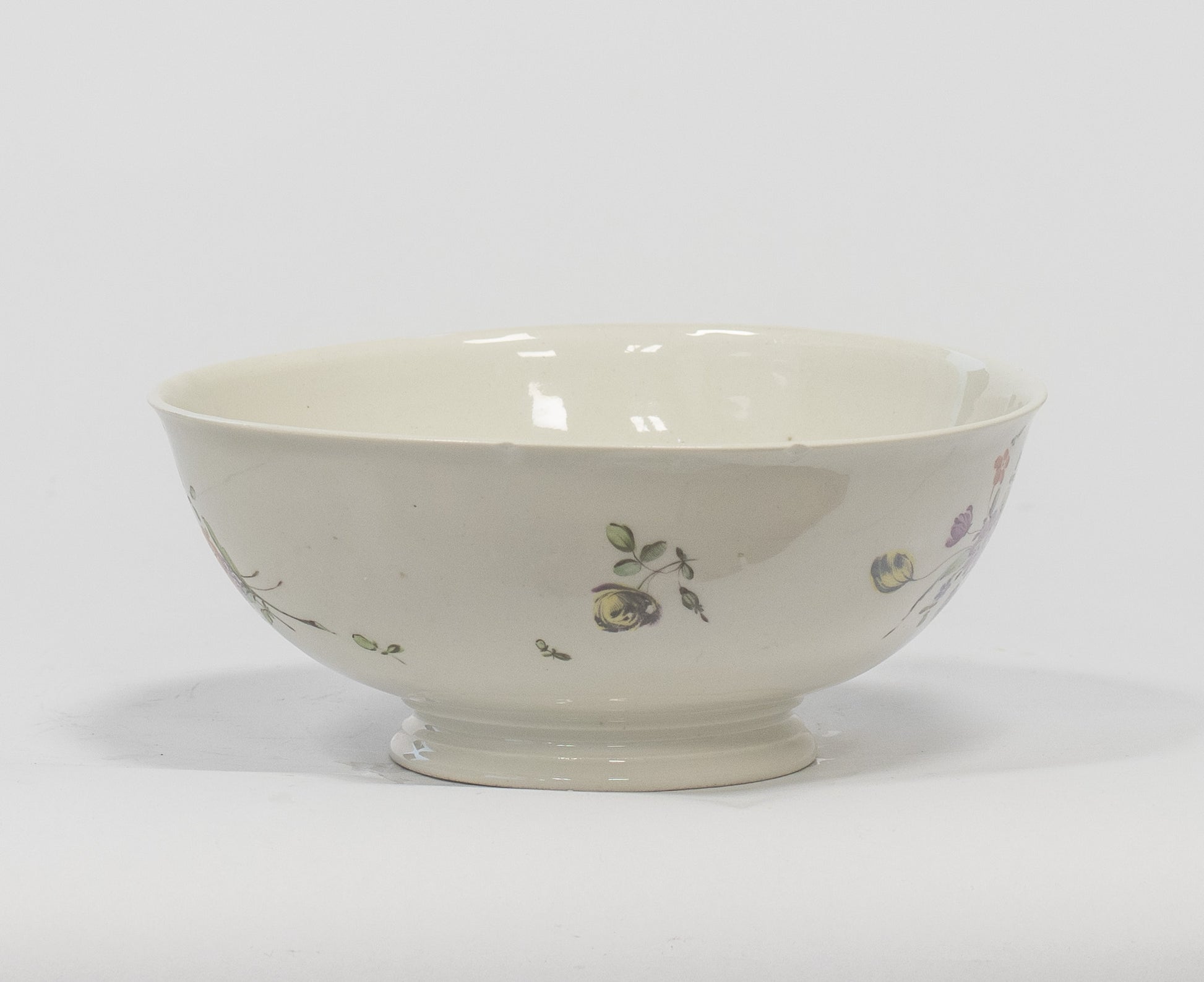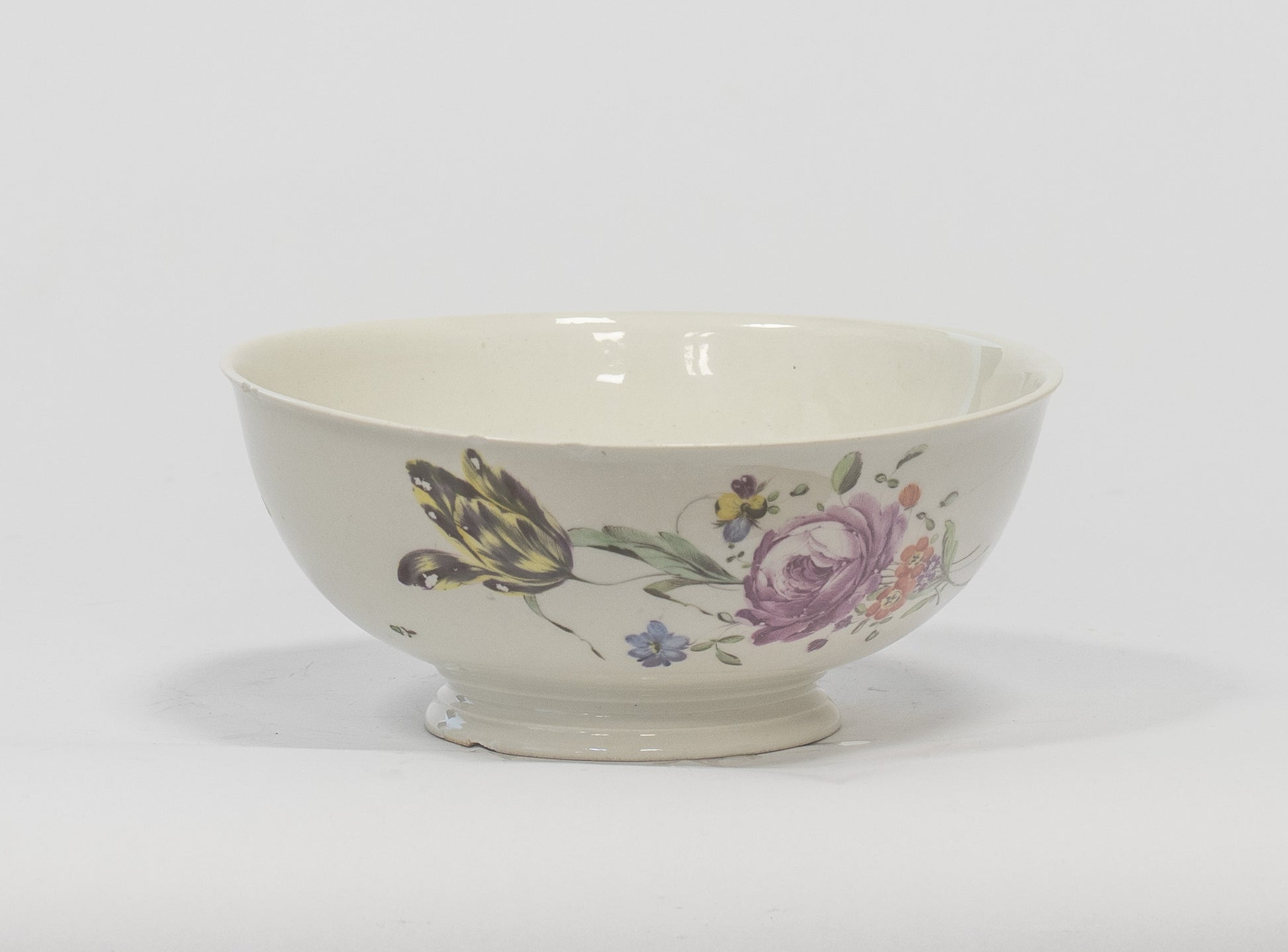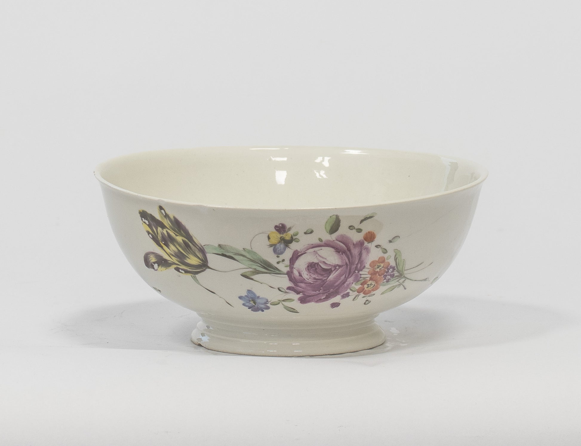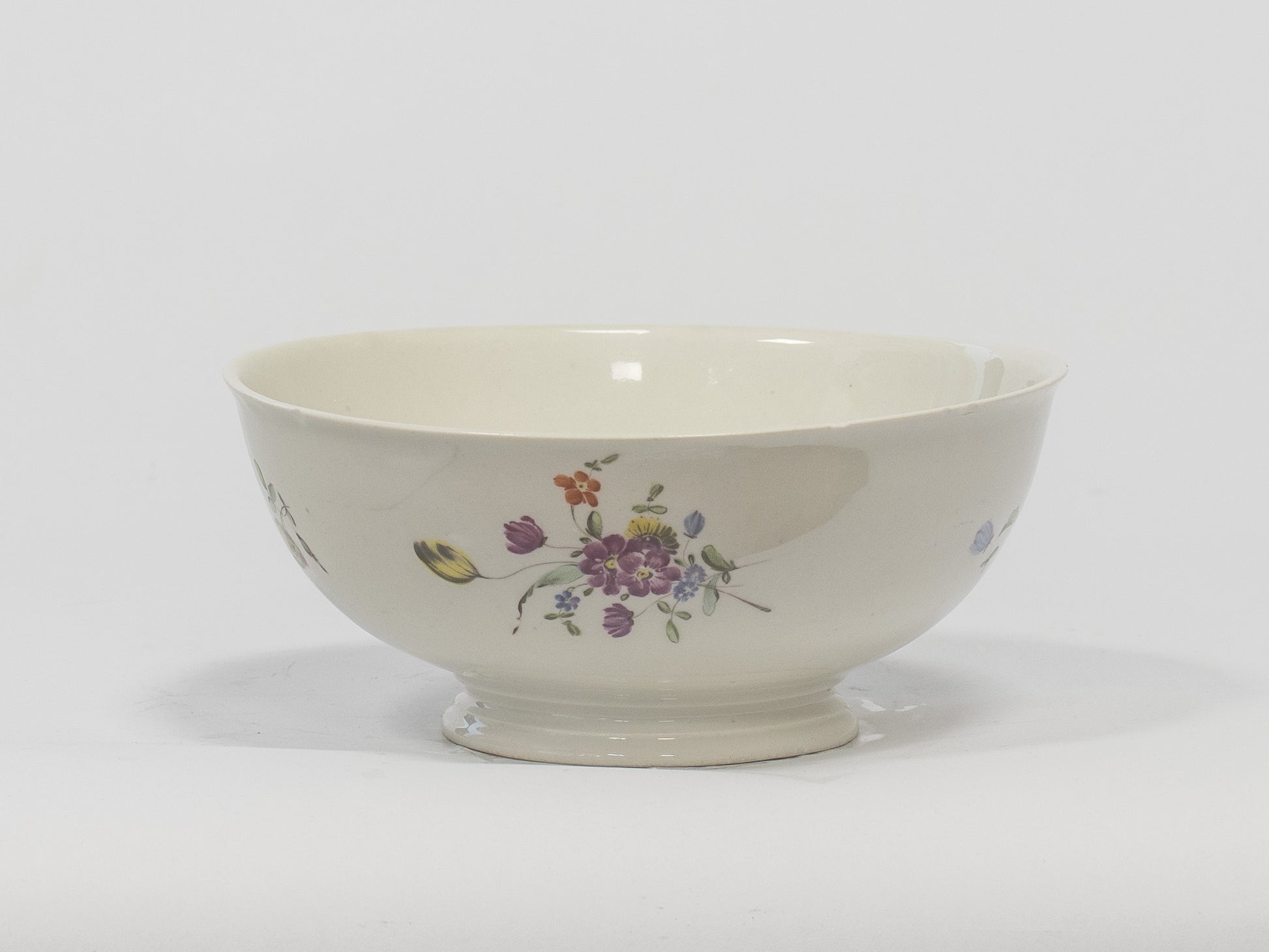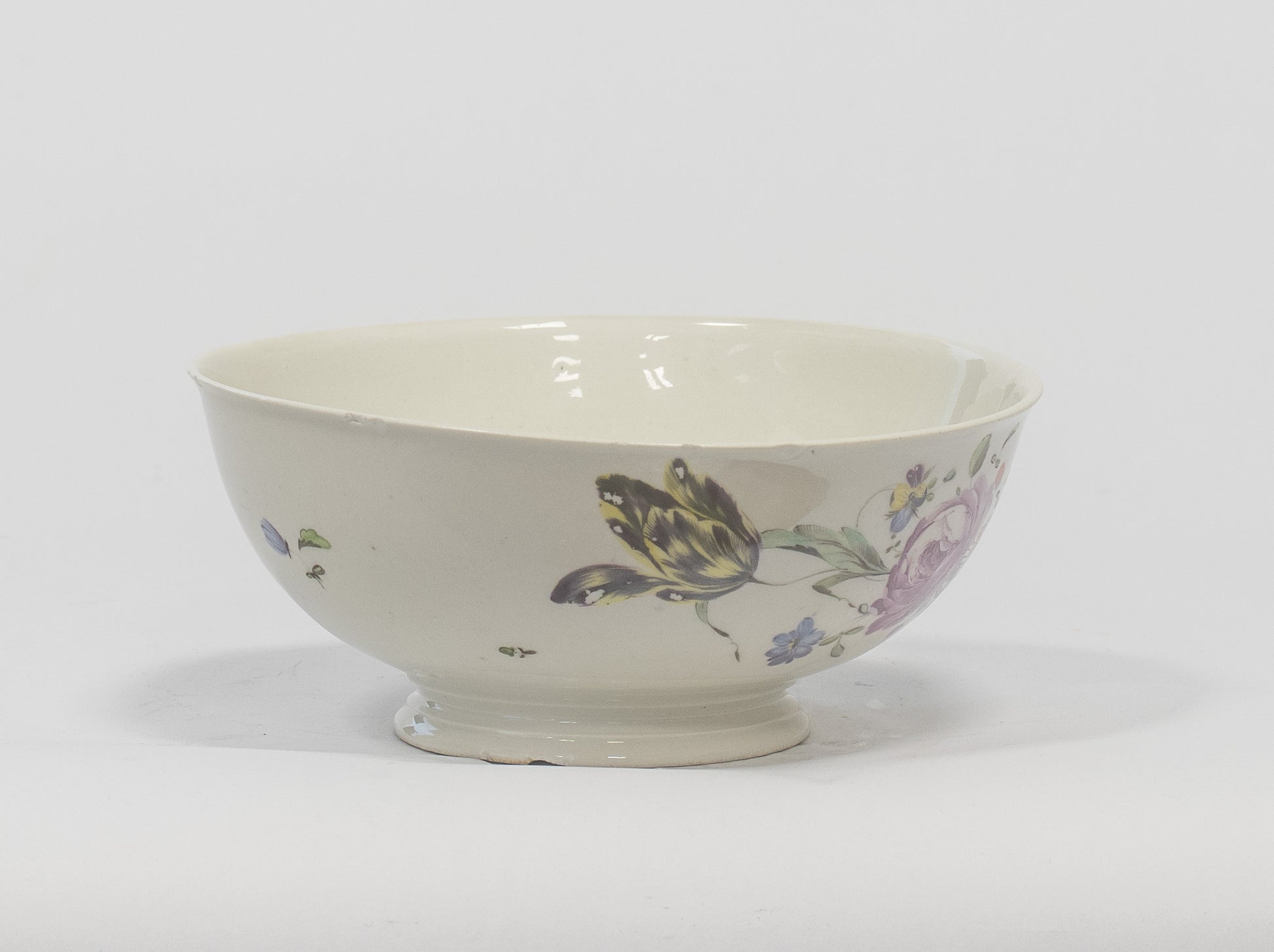 Durchmesser ca. 17,5 cm. Höhe ca. 7 cm. Mit handgemalten Blumenmotiven. Kleine Absplitterungen an der Oberkante, eine am Fuß.