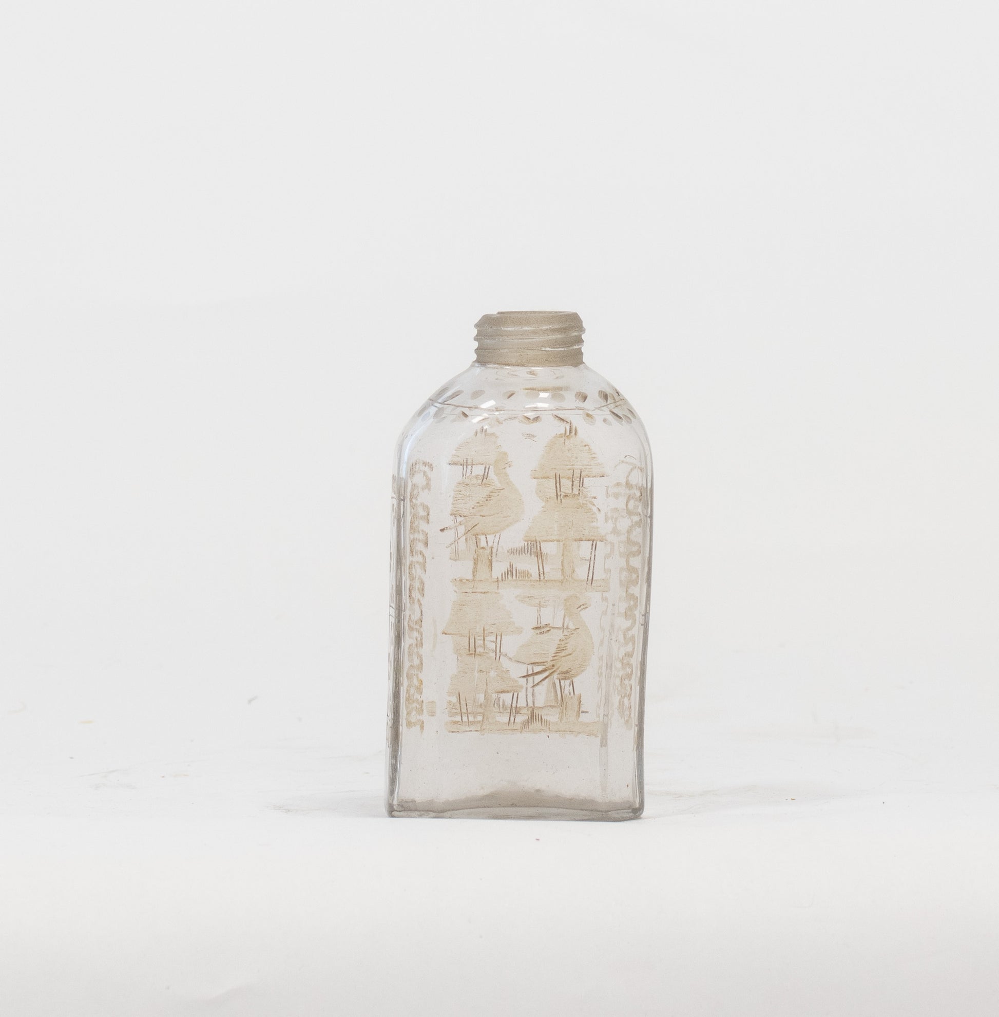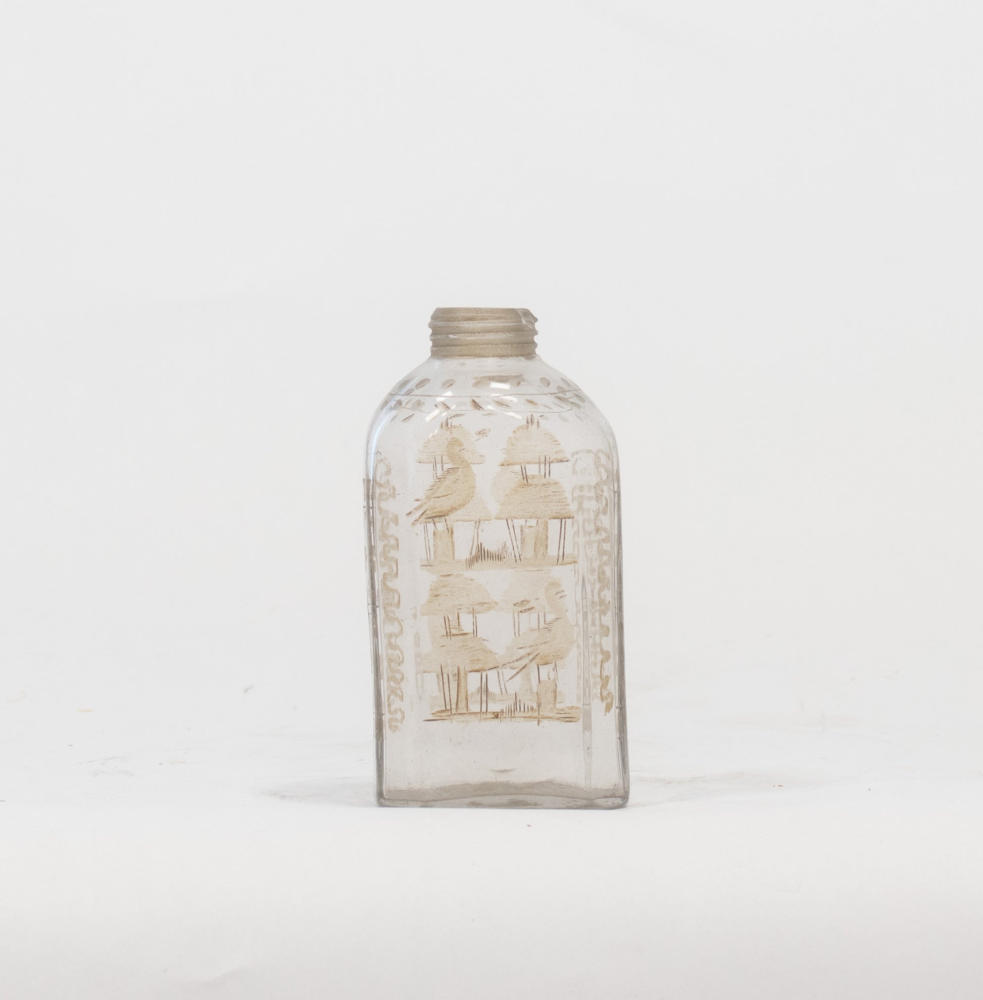 Schön graviert mit Vögeln, Bäumen und Wappen. Chip am Hals. 13,5 cm hoch.