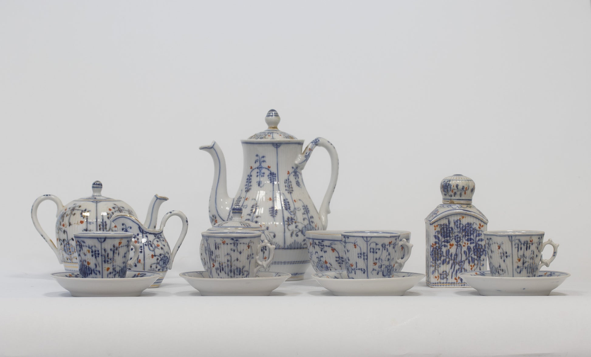 Bestehend aus Teekanne, Kaffeekanne, Zuckerdose, Teedose, Schüssel, Milchkännchen und 9 Tassen mit Untertassen. Der Deckel der Kaffeekanne ist geklebt. Der Deckel der Teedose hat einen kleinen Chip. Thüringen.