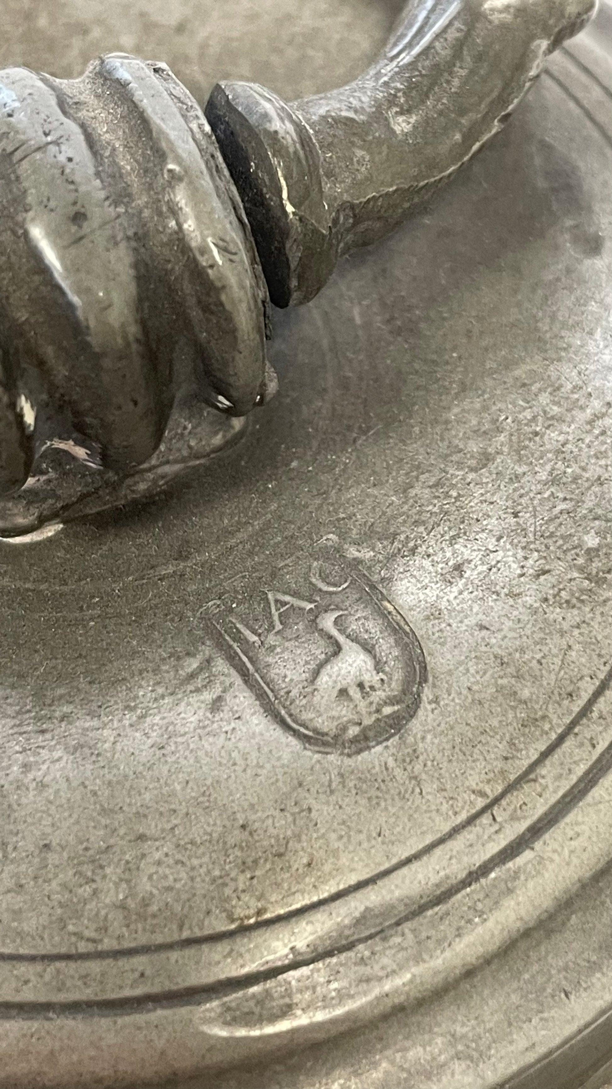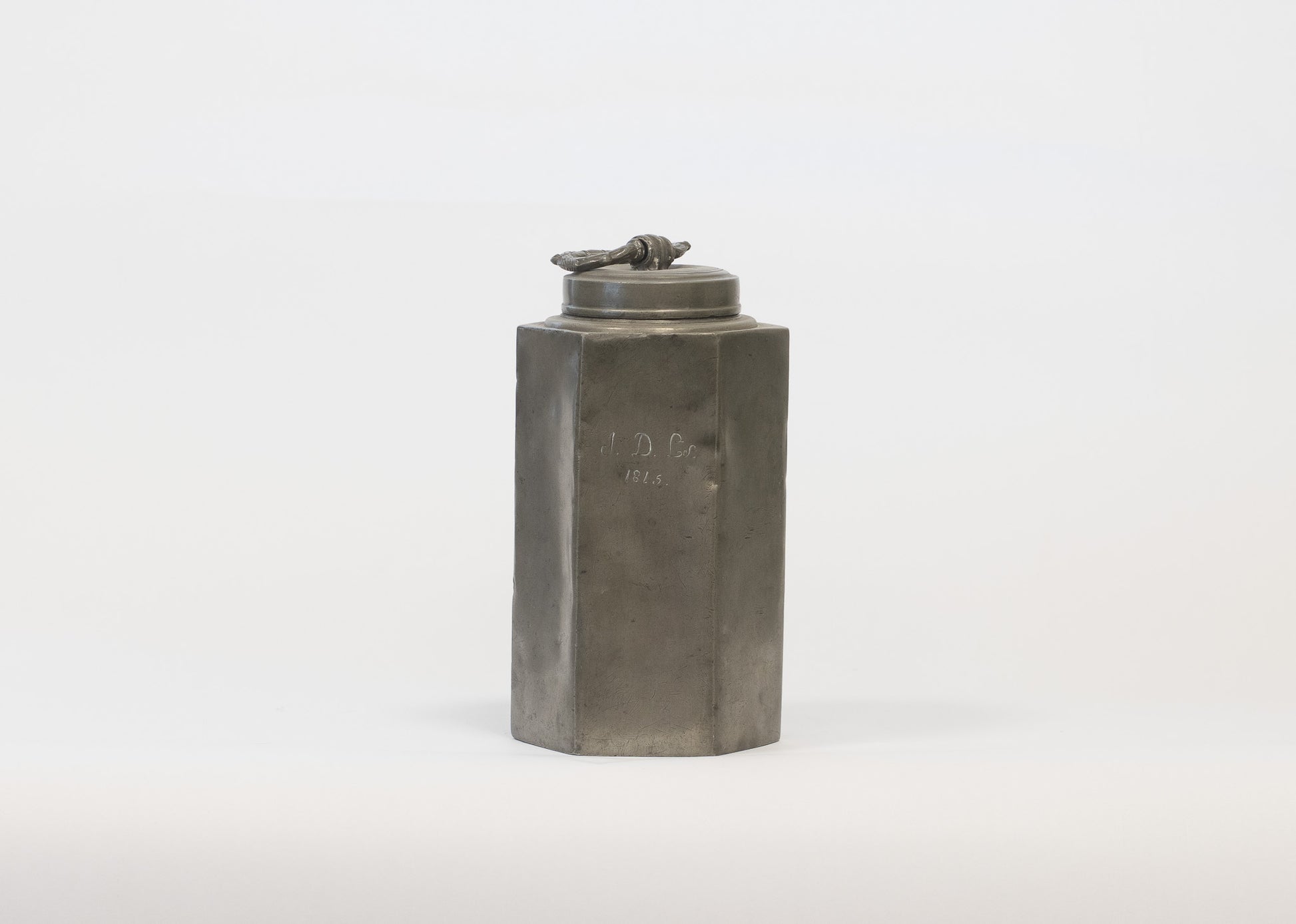 sechseckiges Zinngefäß mit Schraubdeckel. Datiert 1815. Auf dem Deckel markiert. Auf drei Seiten eingravierte Blumenmotive. ca. 22cm hoch