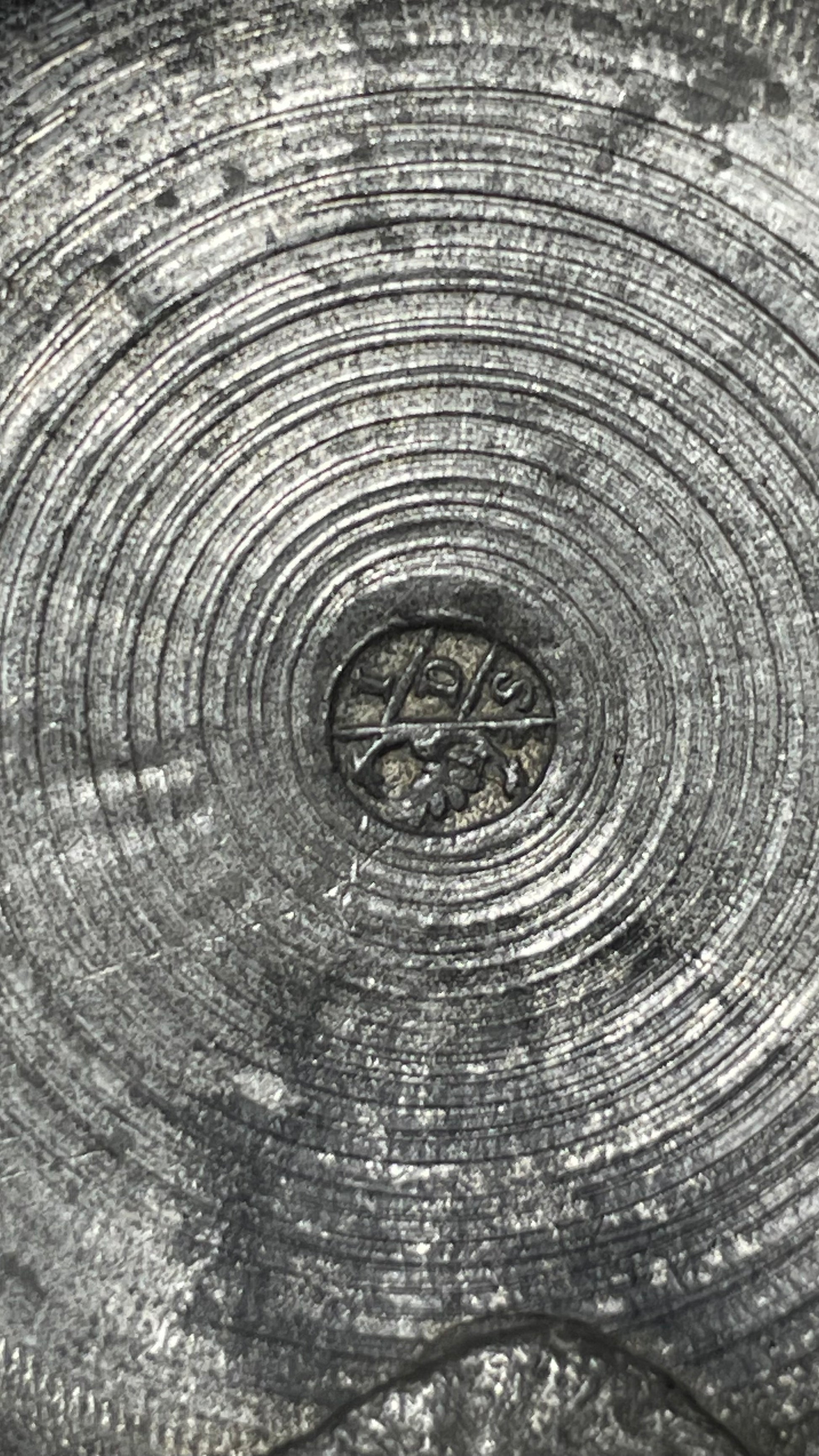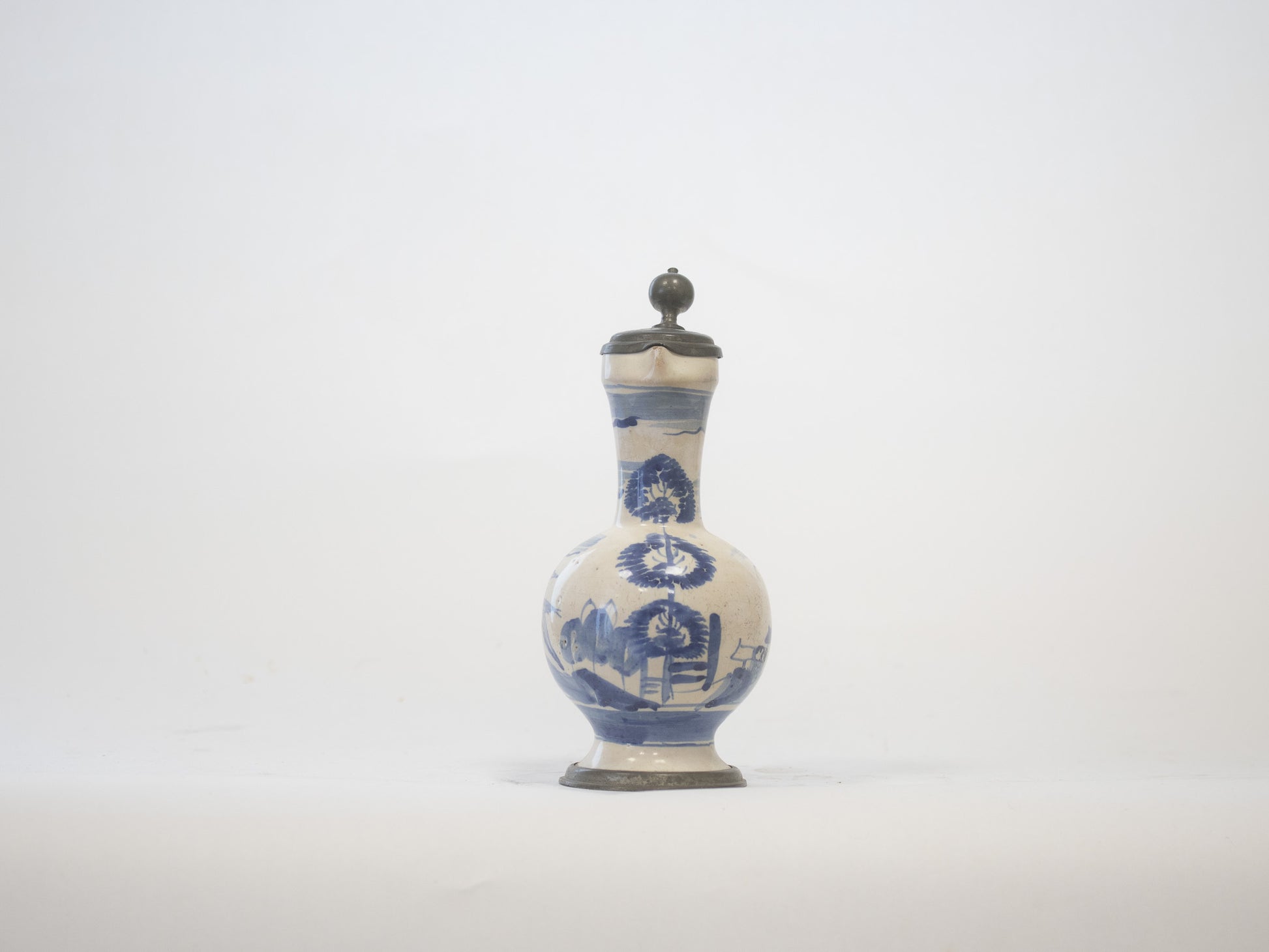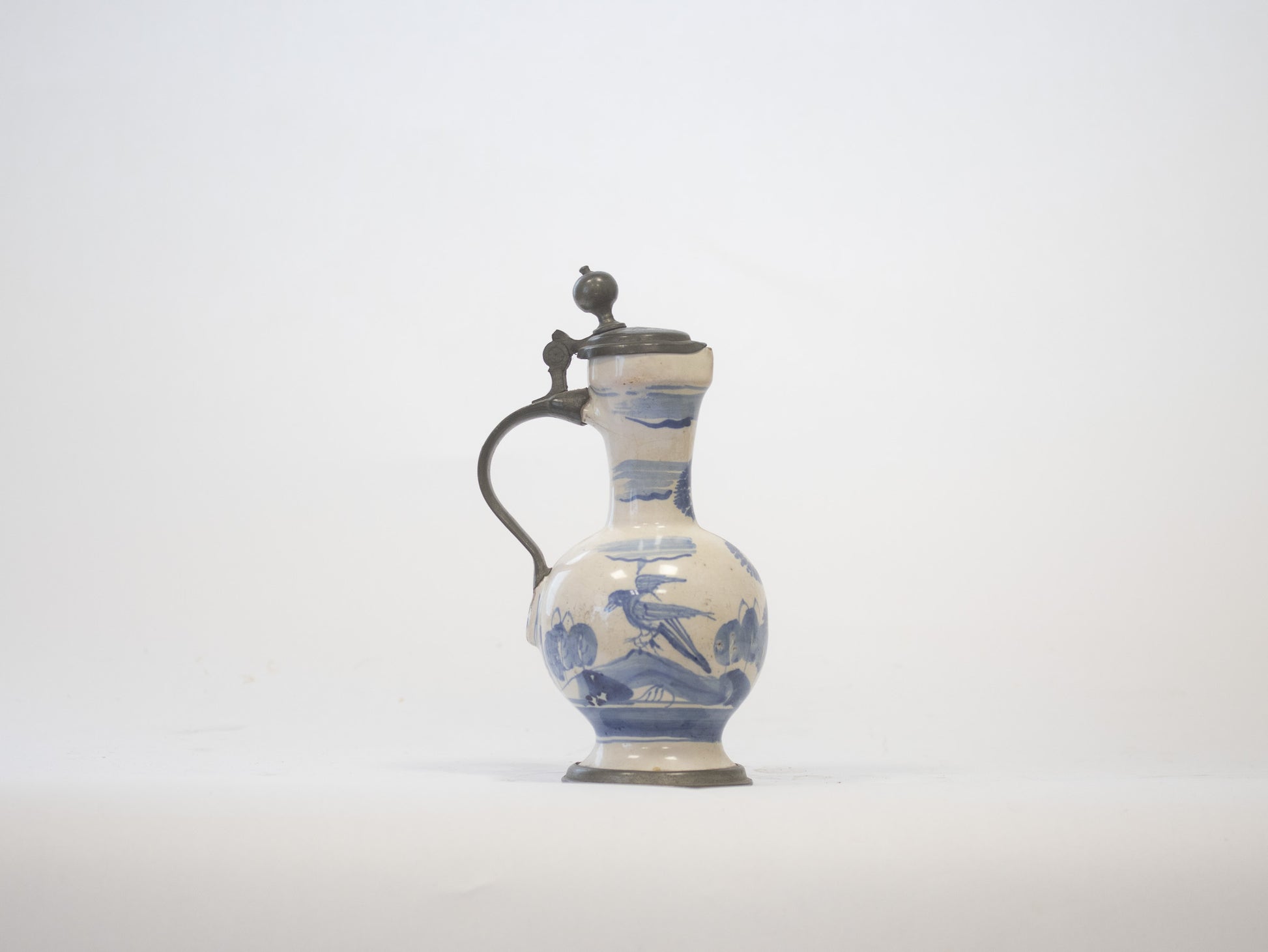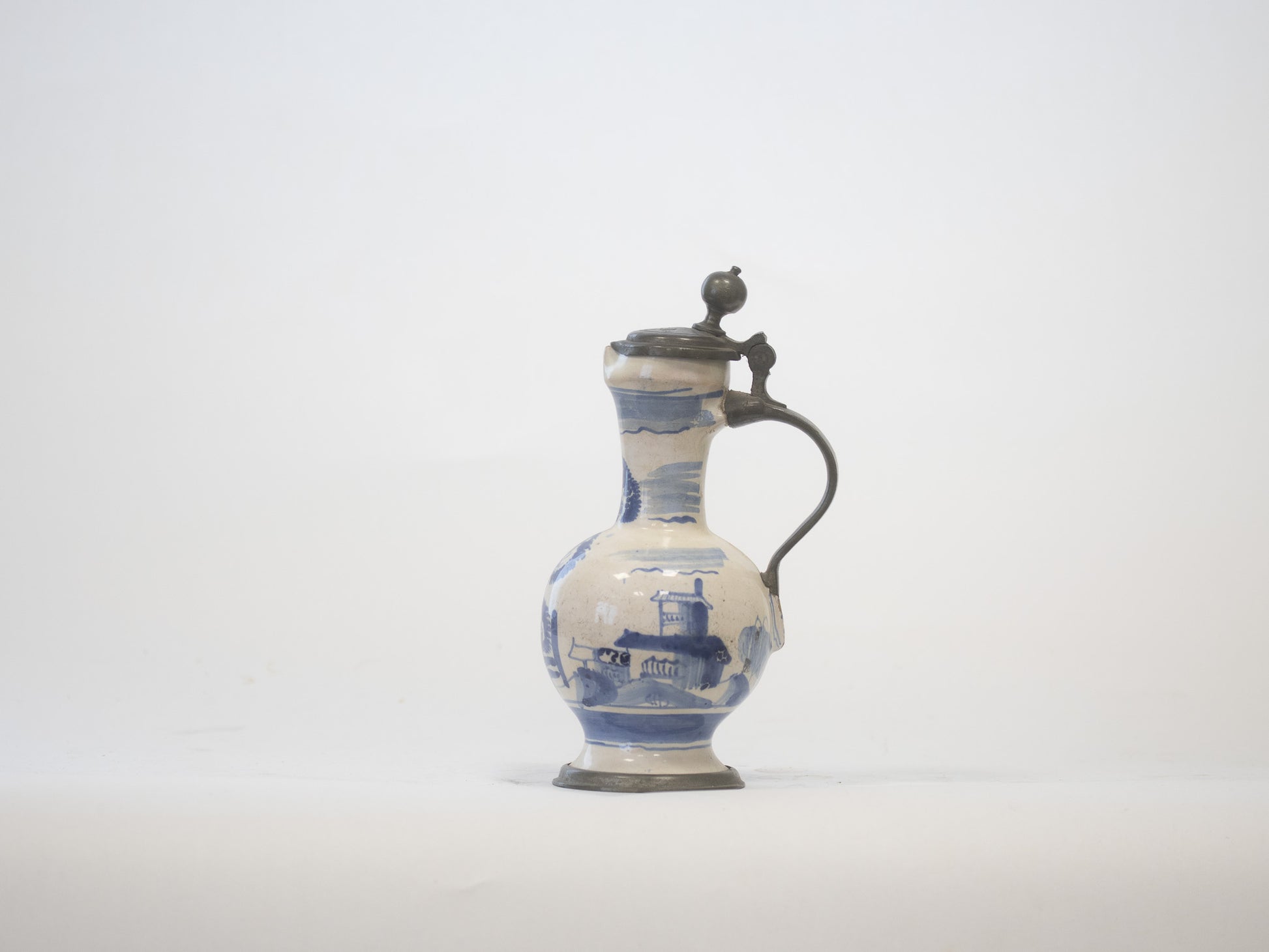 18e-eeuwse Continentale Faience schenkkan met tinnen montuur, beschilderd in blauw en wit. 18cm hoog. Frankfurt.