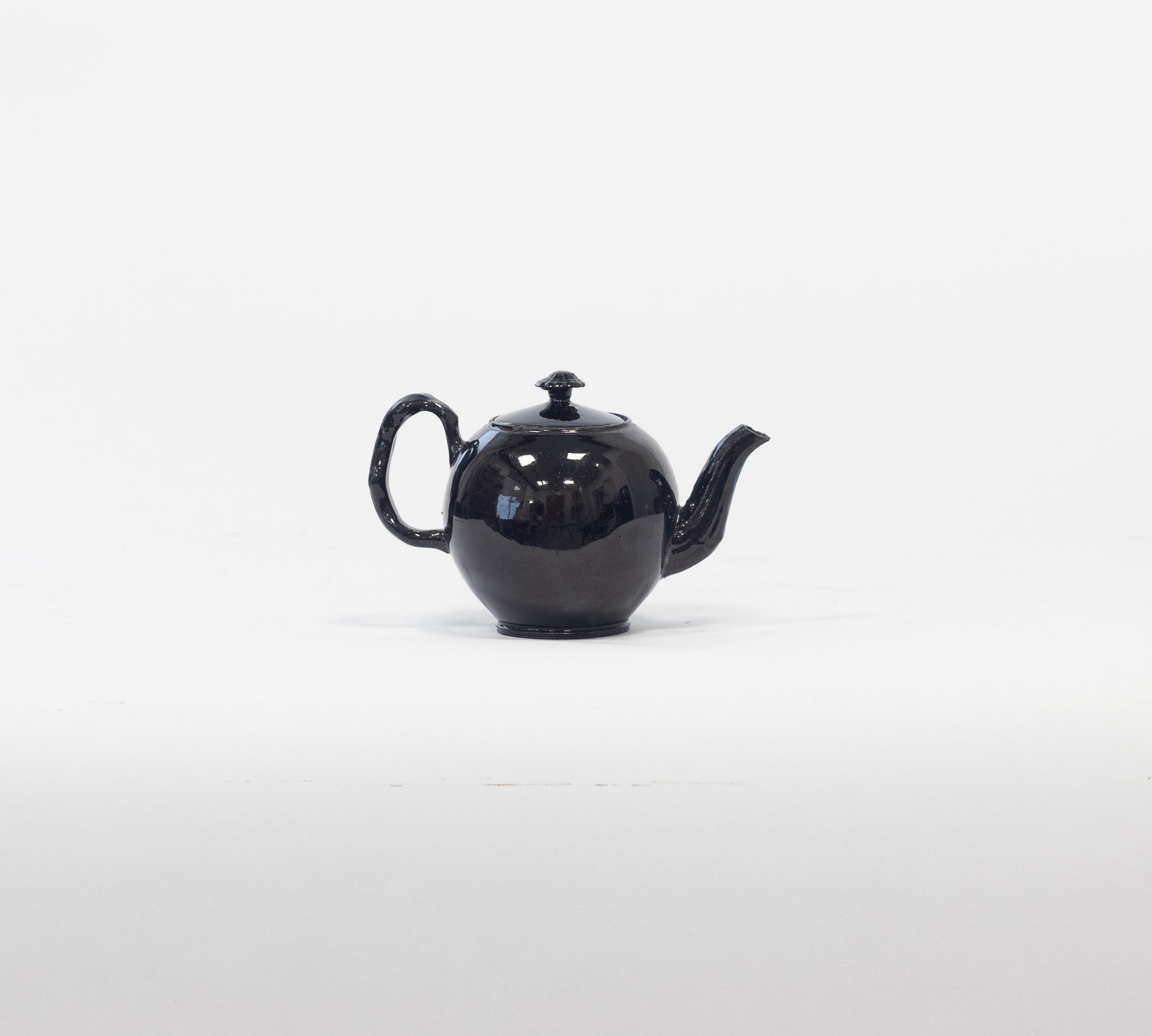 Engels zwart aardewerk theepot. ca. 8,5cm hoog. Paar minuscule chipjes aan de deksel en tuit