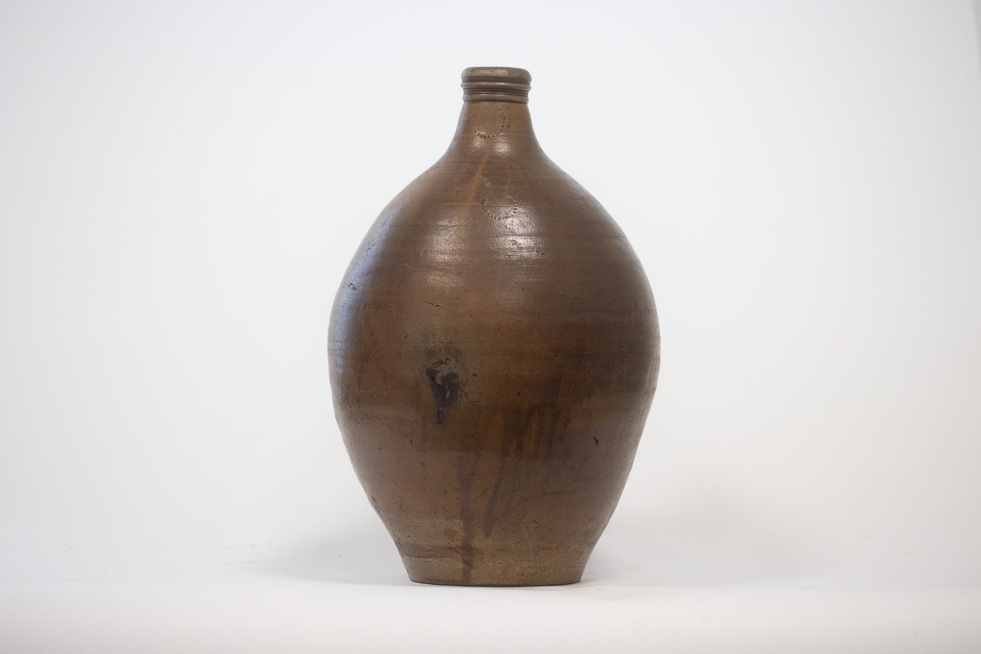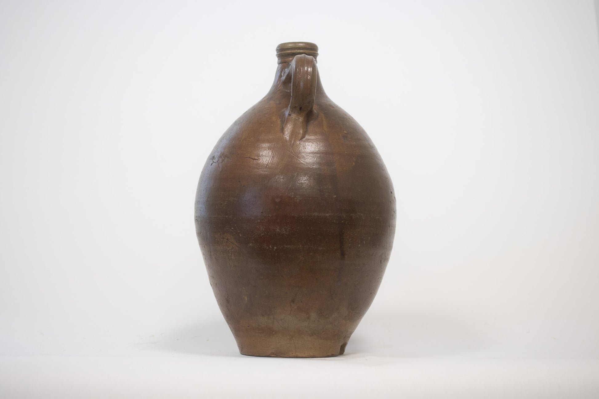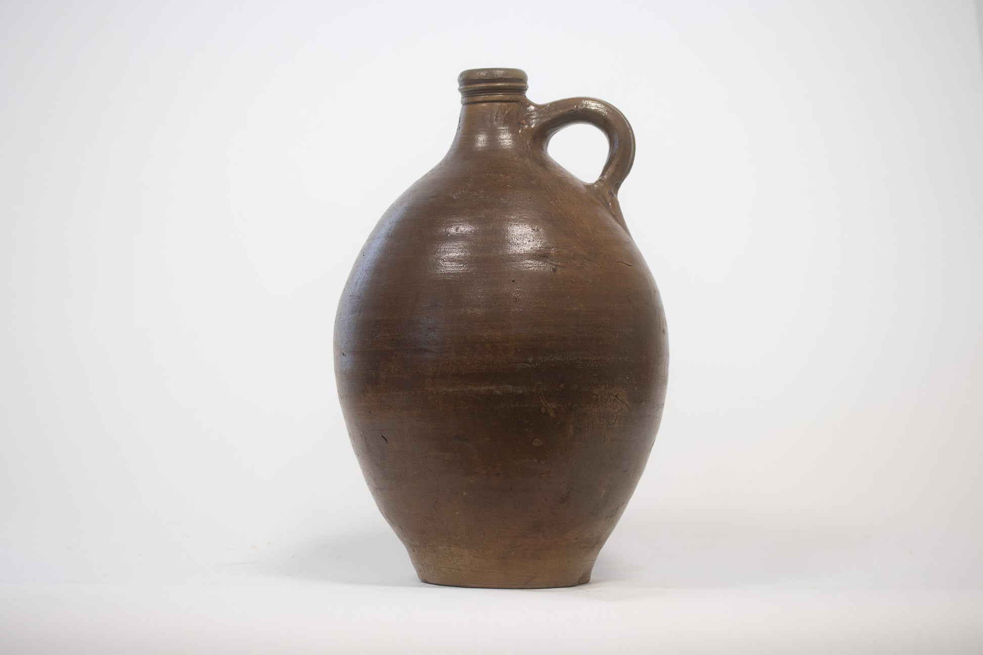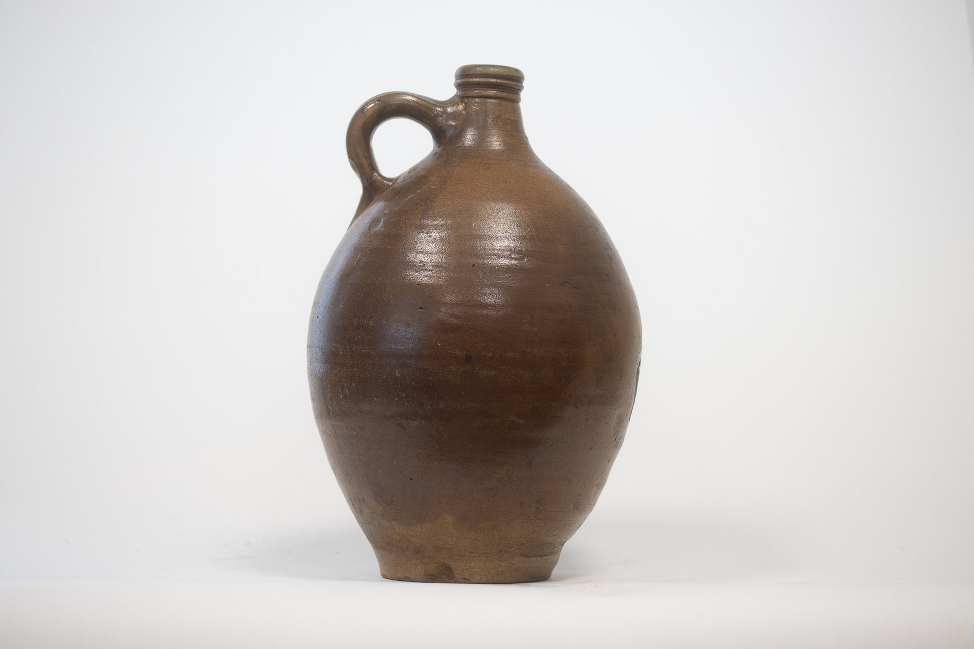 Een mooie gave antieke geglazuurde kruik. Olie of azijnkruik 19de Eeuw. De kruik heeft een mooi bruin zoutglazuur en profielringen onder de mondrand. Hoogte 36cm.